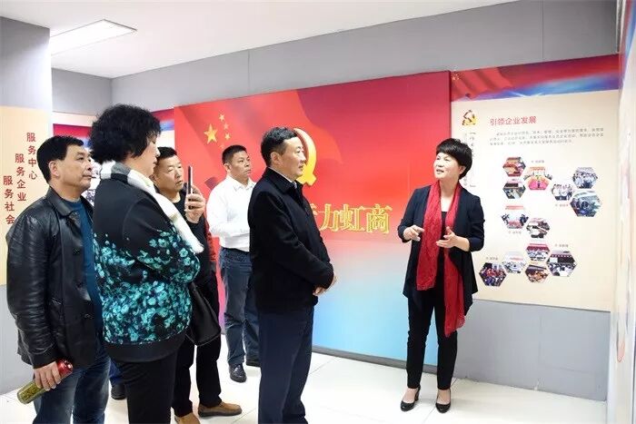我会党建工作指导员林丹向天心区的嘉宾们介绍了虹桥商会的发展情况,带领他们参观了商会工作宣传栏和小组活动展板,并围绕商会“服务中心、服务会员企业、服务社会”的宗旨,首创了“商会+会员企业”党建工作模式受到中央组织部高度肯定并荣获《“创新中国”工作特别奖》,在引领会员企业发展、引领会员参政议政、引领会员思想建设、引领会员热心公益事业等方面进行了生动地讲解。