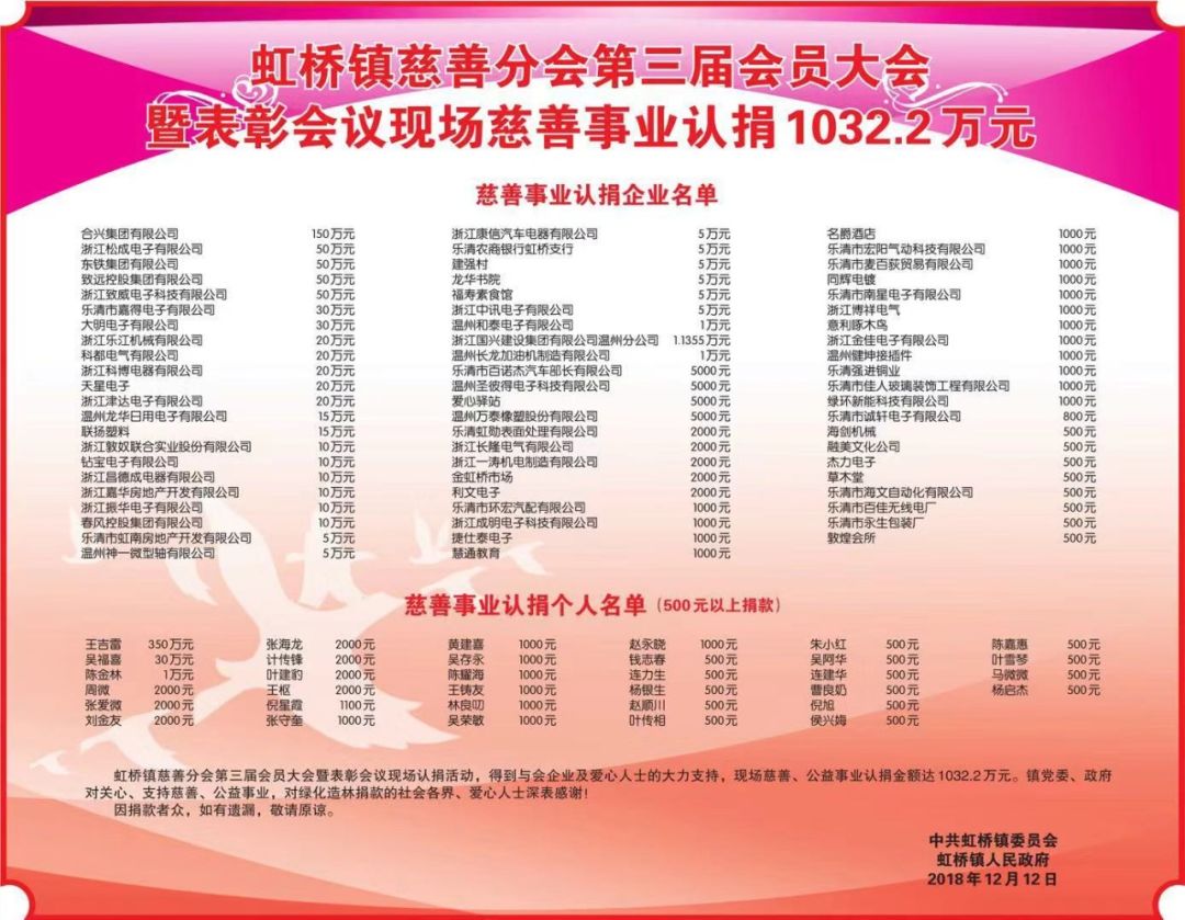 会议听取了虹桥镇慈善分会第二届理事会相关工作报告并选举了第三届理事班子。在《虹桥镇慈善分会第二届理事会工作报告》中提到,虹桥镇每年有20余家企业捐赠20万元以上;虹桥商会会长单位东铁集团,常务副会长单位致远控股、松成电子每年捐资达50万元以上;特别介绍了常务副会长单位合兴集团十年捐资合计达1000万元,为虹桥镇慈善事业的发展创造了良好的氛围,树立了学习的榜样,奠定了坚实的基础。
