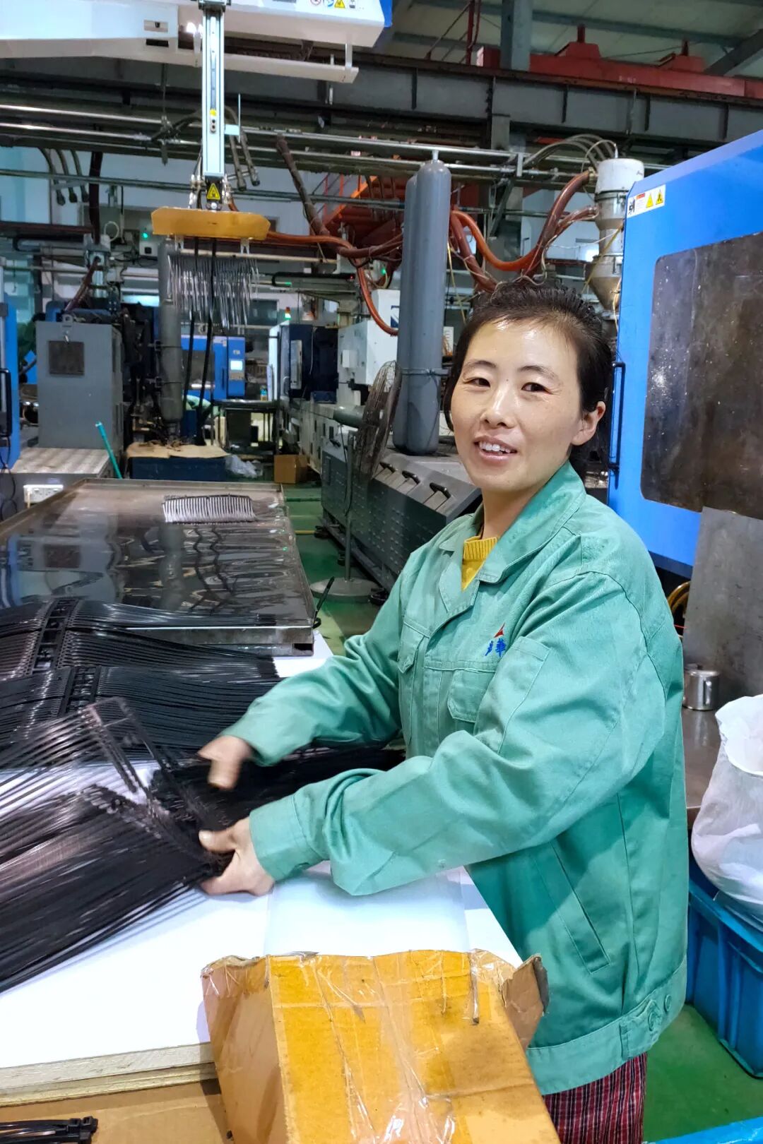 戴厚春是湖北省仁和坪镇人,2013年2月来到温州龙华日用电子有限公司工作,成为注塑车间的一名员工,她的工作就是将注塑机机械手夹出来的尼龙扎带,从料干上把扎带掰下来,按客户订单要求将数量装进袋子里。