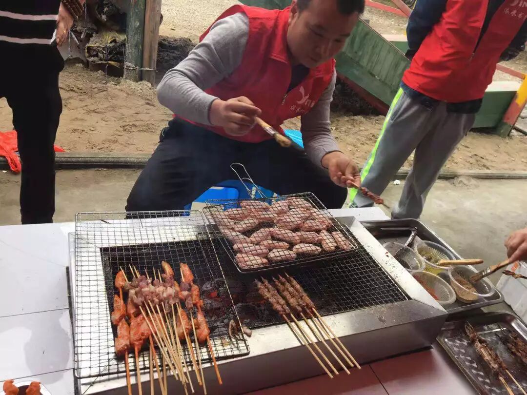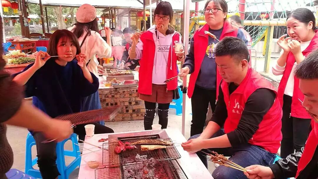 本次活动有将近50人参加,全体学员集中学校统一包车出发。早上10点左右,抵达黄金甲农庄,之后进行了团队分组烧烤,共分A、B、C、D、E5组。分工完成后大家马上开始动手做烧烤前准备工作,有的生火,有的串肉......忙得不亦乐乎。准备工作完毕,大家把鸡翅、鸡尖、虾等摊在烤架上,各展身手,烧烤大厨们一边烤食物一边上调料,一手拿刷子刷油,一手拿叉子翻滚,而遇到旁边的小白时便提醒该伙伴要刷油啦、该翻面啦,一步步指导,不一会儿,阵阵烤肉的香味四溢。实在是抵挡不住烤肉的诱惑,很快,一个个成品一出来就被洗劫一空,尤其是烤鸡翅鱼片,那叫一个美味。