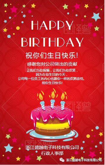 Wonderful graphic为了弘扬公司企业文化,让每位员工感受到集体的温暖与关怀,浙江盛越电子科技有限公司为本月生日的员工举办生日派对,对员工长期以来的辛勤工作给予了肯定和感谢,也表达公司对员工的点滴关怀,不断熏陶员工的工作精神及个人情操,营造轻松和谐的工作环境与人际关系,进一步增强员工的集体荣誉感、责任感和使命感,培养员工坦诚友好团结的工作态度和工作作风,培养企业团队精神,塑造良好的企业形象,全面营造一种“理解员工、关心员工”的文化氛围!