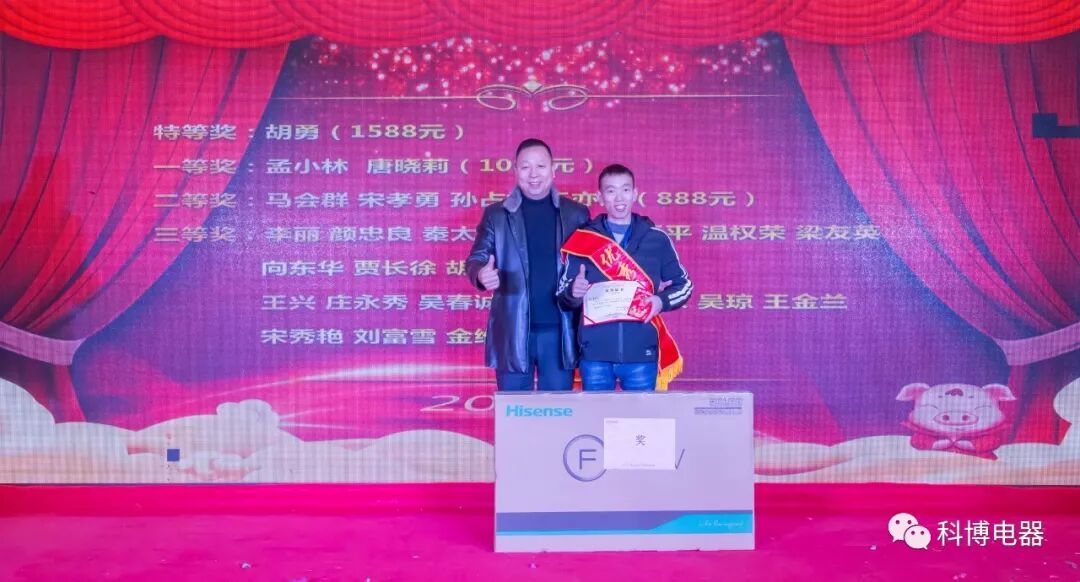 2019年1月29日,沐浴着新年的曙光,满怀着胜利的喜悦,科博电器隆重举行2018年度总结表彰大会暨员工答谢宴。公司董事长兼总经理杨迎龙、各职能部门领导及全体员工参加了活动,共同度过难忘而欢乐的一天。