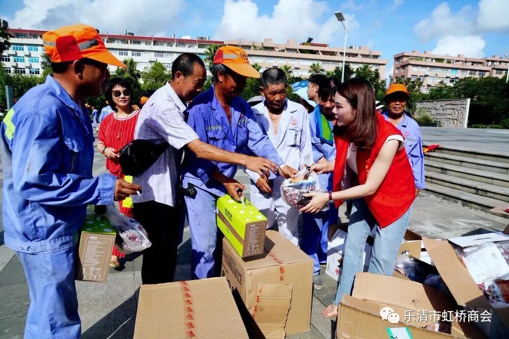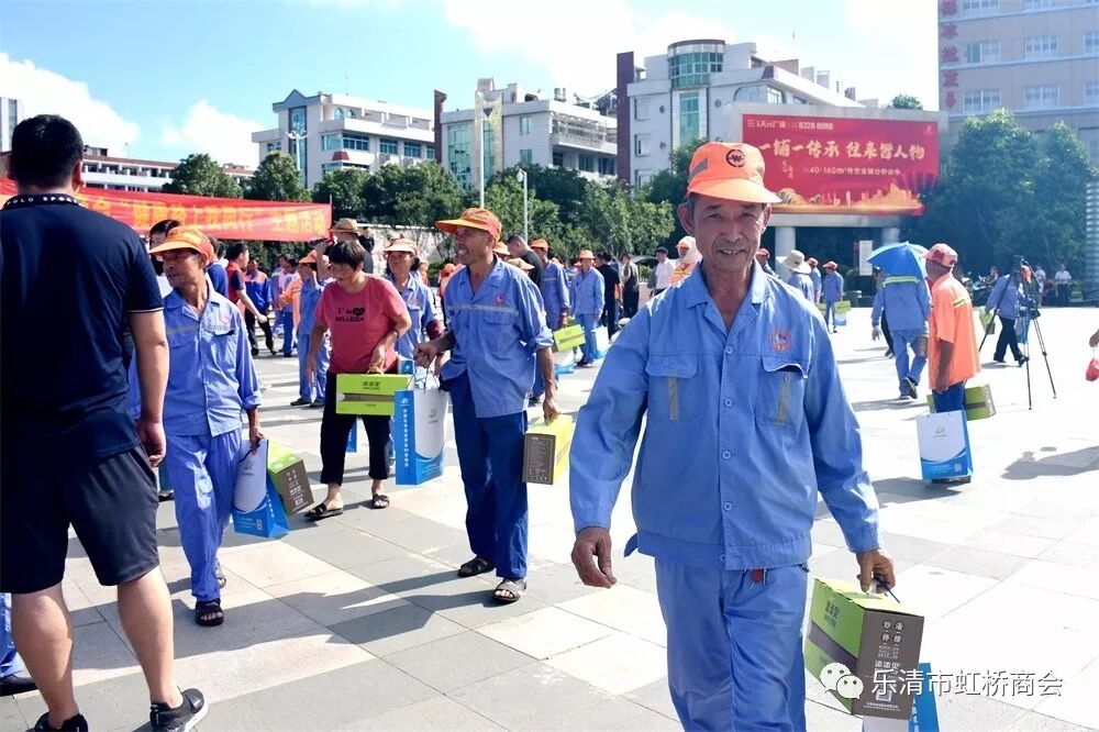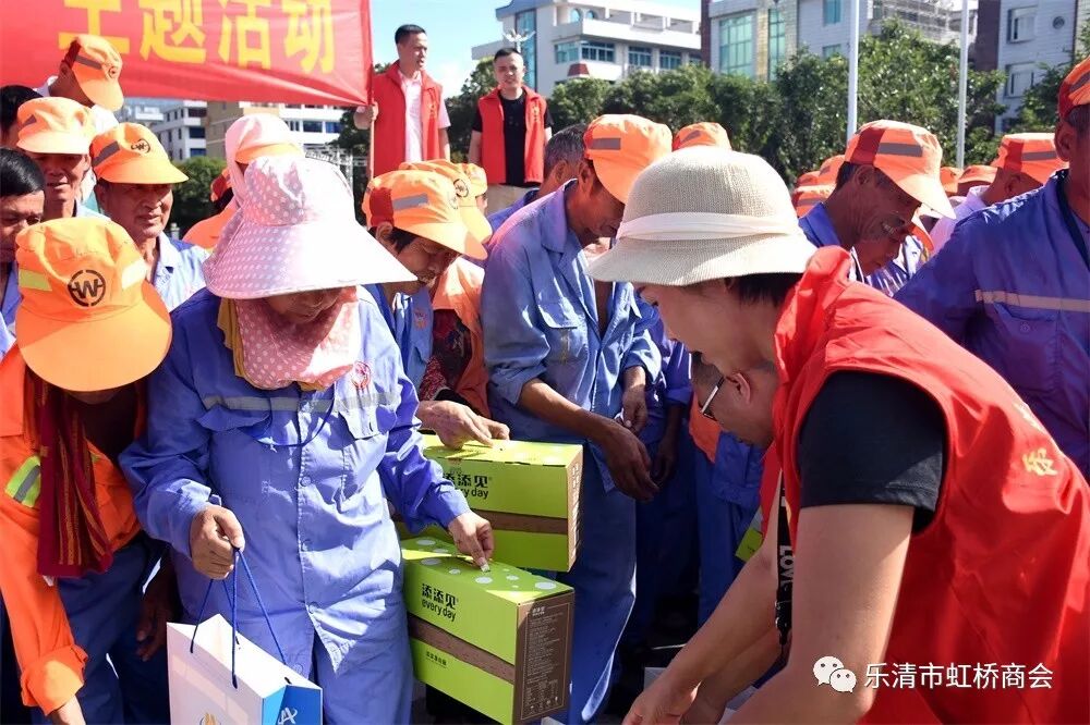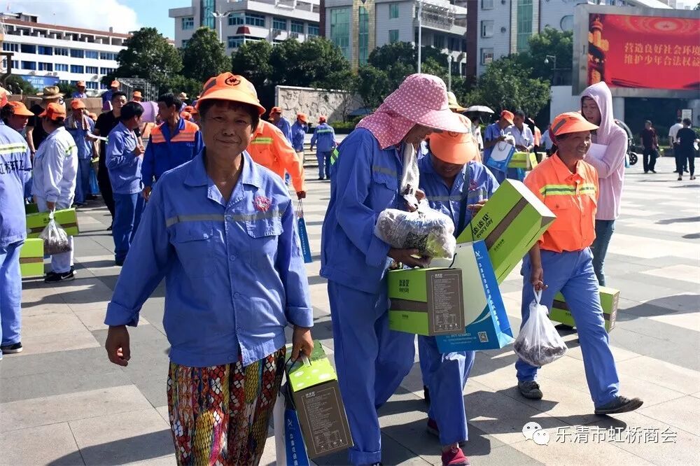 可谓骄阳似火、酷暑难耐,勤劳的环卫工人们仍旧挥汗如雨,奋战在城镇清洁的第一线。在虹桥镇文化广场上,摆放着一箱箱送给环卫工人们的礼品,今年不同以往,虹桥商会为他们准备了红枣、山药面、午时茶等,这些别有新意却与健康息息相关的礼品代表着虹桥商会全体会员对环卫工人们的关心。