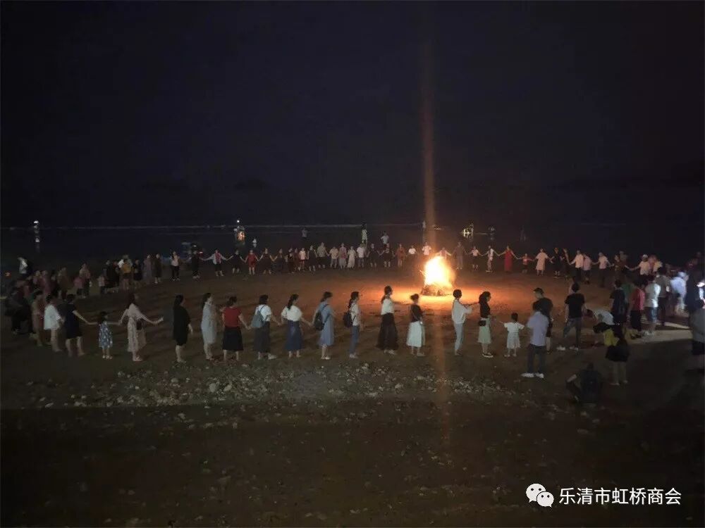 晚上20点,大家又来到沙滩上,玩起了篝火晚会,一群人围着篝火,双手放到前方同事的肩膀上,听着音乐,大家跳起了兔子舞,不一会又玩起了老鹰捉小鸡的游戏,之后又围成一个圈玩起了丢手捐的游戏,沙滩上不时传来阵阵的笑声,玩出了一身的汗。