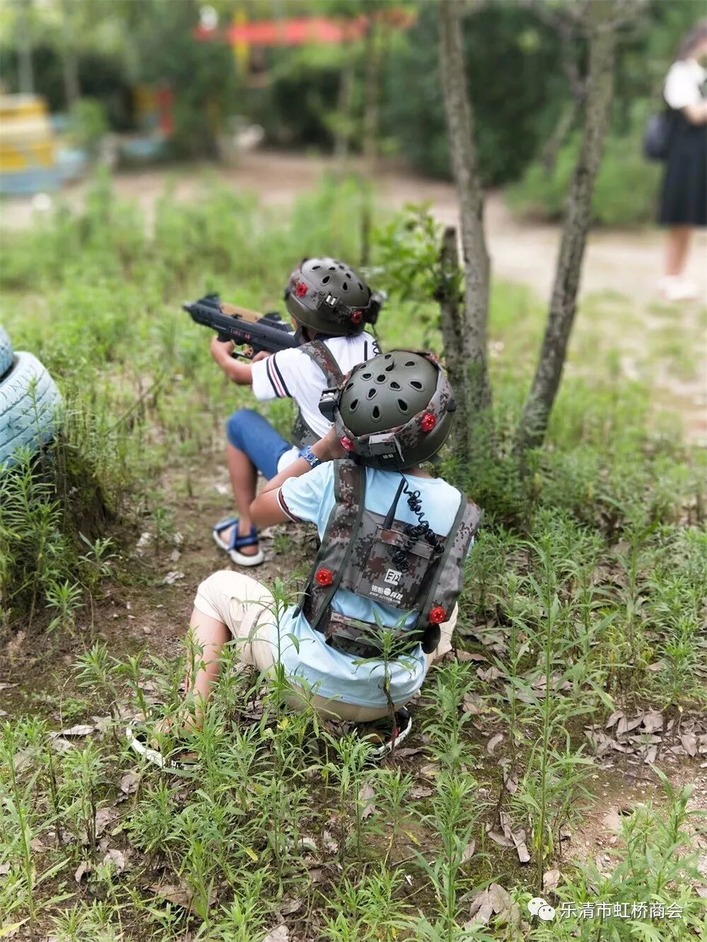 中午饭后,大家又体验了一把真人CS,大家身着迷彩服,分成二队,手持模拟设备在草丛中、树丛中间穿梭奋战,一旦看到对方的人,大家拿起模拟枪支向对方不停的扫射,那叫一个开心。