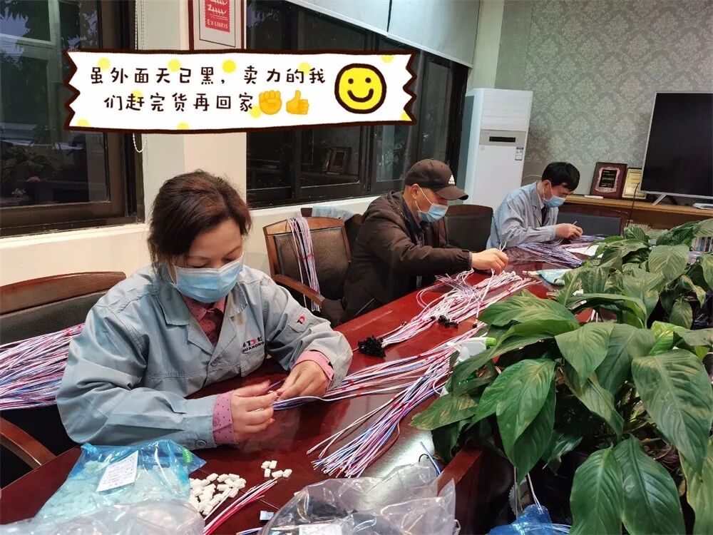 战“疫”不松懈,发展不停步。在受到疫情的影响,工人还未全部到位,眼下公司交期紧,人员不足,提高产能产量,我们公司总经理叶立明亲自带领行政管理人员下一线,公司总工程师,部门领导全部干起装配工作,此外,我们还找了多家外加工点帮忙生产加工,召集了一大批外带装配个人户帮忙装配,帮助解决生产发货,使公司尽提升产能,目前公司产能已恢复75%左右。