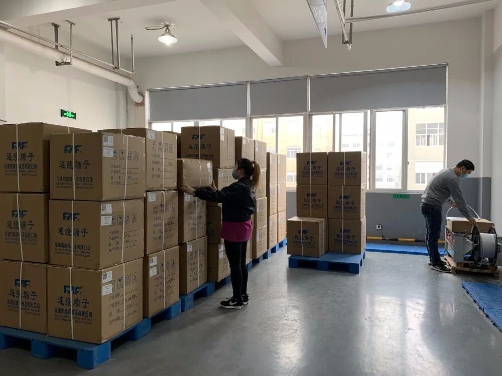 到岗的员工们奋勇争先齐上阵,将一件件产品装上车辆,前来运输的车辆快速将产品运送到急需的客户手中。