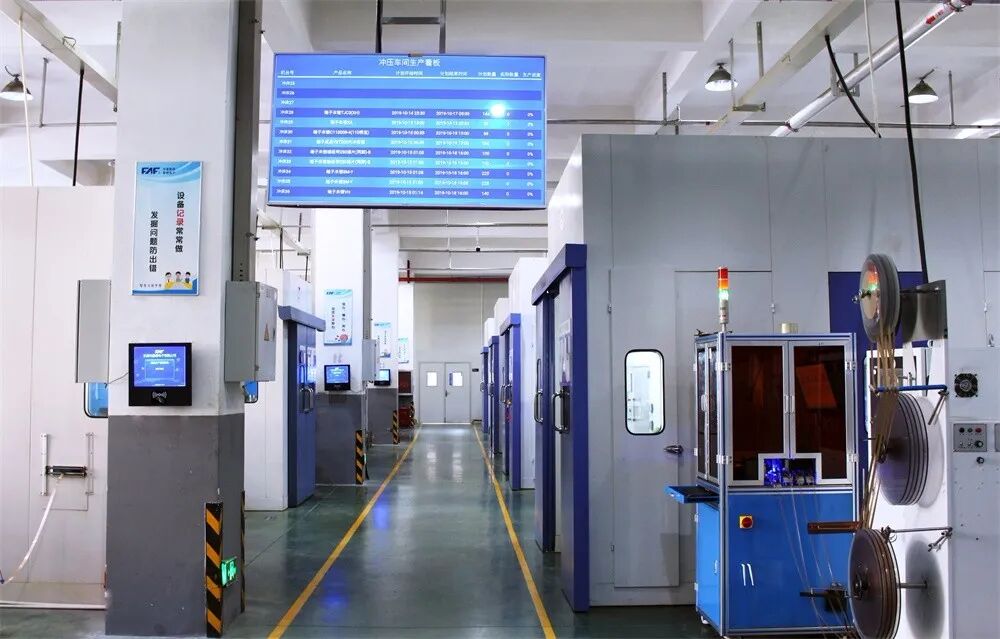 走进生产车间,随着高速冲压机、自动化来料供应系统、智能化编带一体机的有序运转,只见几名工人正在来回巡视、操控着几台机器,生产正在忙中有序展开。