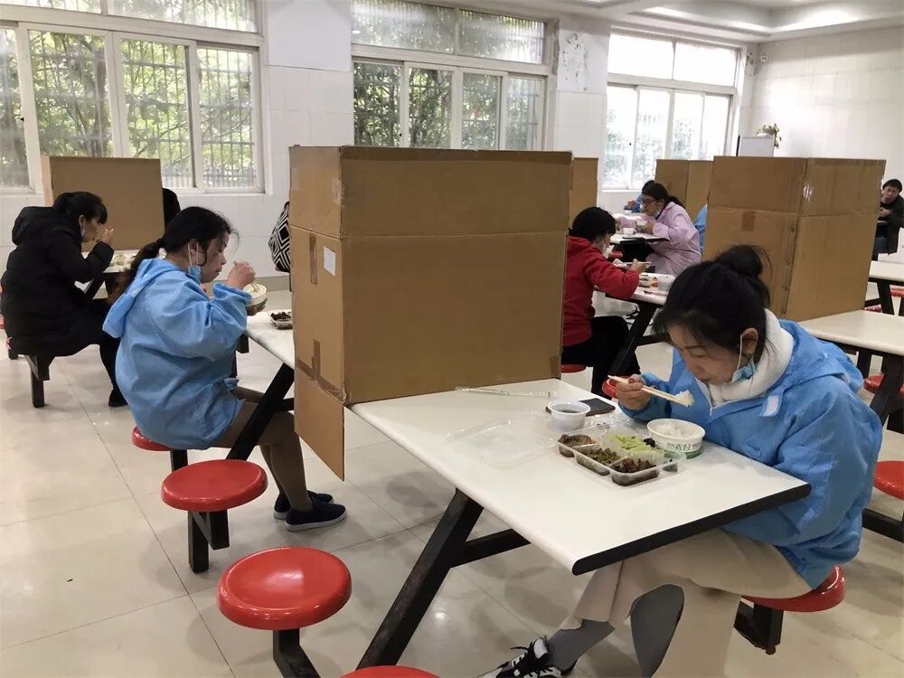 天星电子对员工就餐施行了区别管理,有原地就餐条件的办公室员工由办公室负责人到餐厅领取餐食,没有原地就餐条件的一线员工,公司施行分批就餐,同一张桌子上的人中间用隔板隔开,使员工拥有一个相对独立的就餐环境。