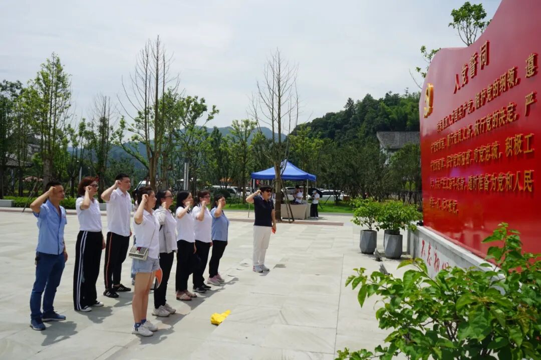 在红十三军教育基地广场,面对纪念碑和鲜艳的党旗,企业第一书记支晓华带领党员同志重温入党誓词,缅怀革命先烈,坚定革命信念。