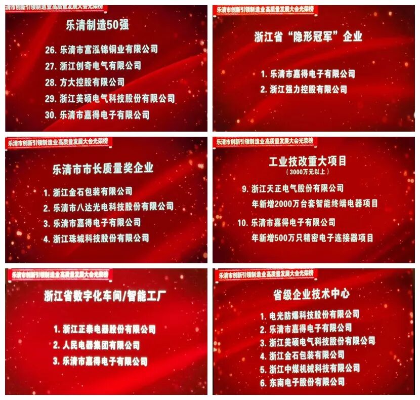 会上,表彰了乐清制造业50强、市长质量奖等一批制造业先进企业。乐清市嘉得电子有限公司作为乐清制造50强第三十名、浙江省“隐形冠军”、乐清市市长质量奖、工业技改重大项目、浙江省智能工厂、浙江省省级企业技术中心等多项荣誉受表彰,董事长周如勇上台领奖,并与国开行浙江分行签订了合作意向协议。